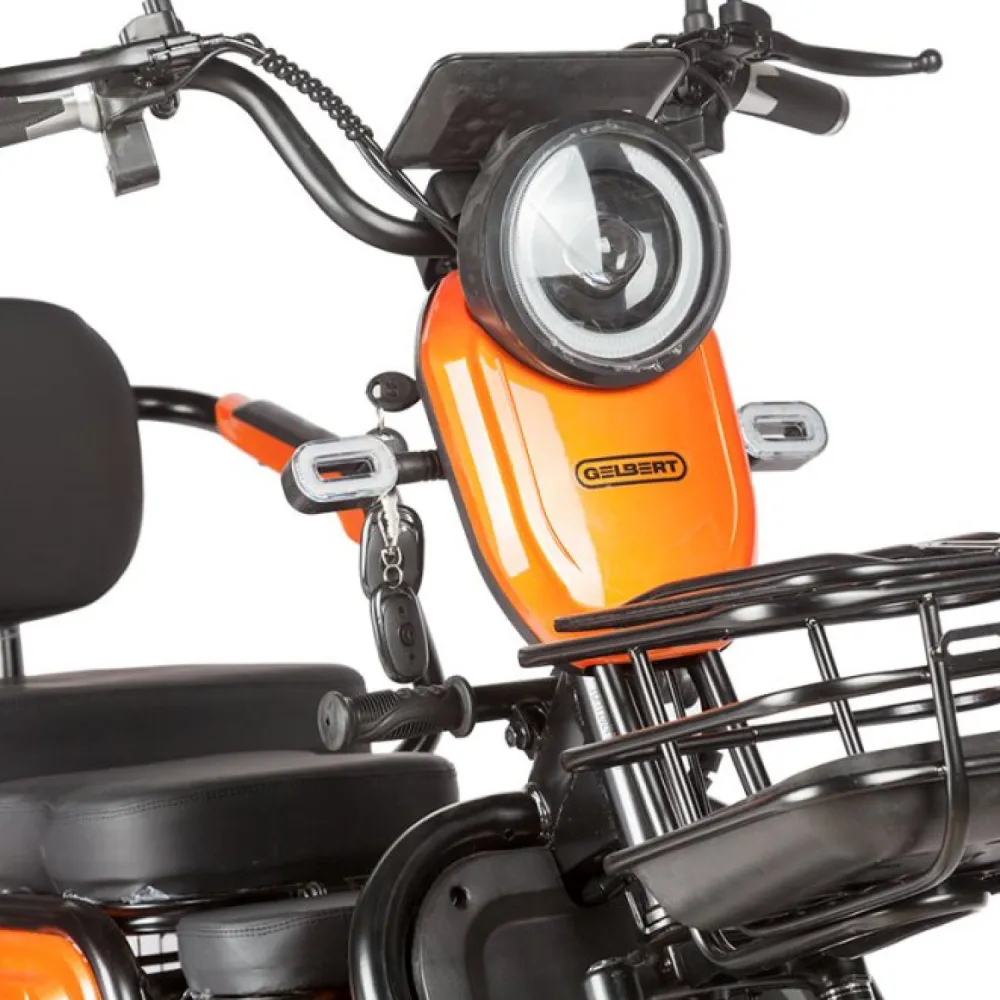 • Дополнительное оснащение: Большой LCD-дисплей информирует о текущих параметрах движения, а яркая светодиодная фара и поворотники обеспечивают отличную видимость в темное время суток. Также модель оснащена встроенной сигнализацией для дополнительной защиты, а передняя металлическая корзина добавляет удобства при перевозке небольших вещей.Электротрицикл Rutrike Gelbert Caf – универсальное решение для тех, кто ценит практичность и современный дизайн. Он станет отличным выбором для ежедневных поездок по городу, позволяя с комфортом перемещаться в условиях интенсивного городского трафика.
