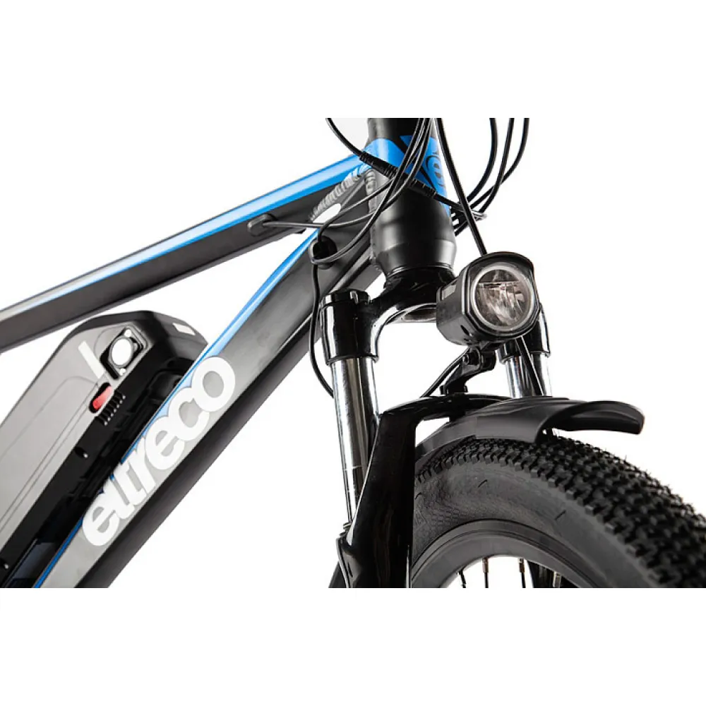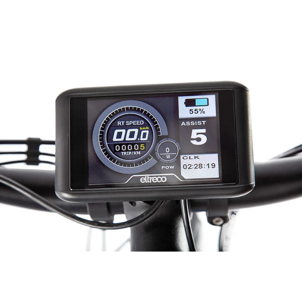 Велогибрид Eltreco XT880D - обновлённая модель от надежного российского производителя, в которой качество исполнения сочетается с комфортом эксплуатации. Электровелосипед создан для езды как по городским улицам, так и по горным и грунтовым дорогам. Мощный двигатель прямого привода обеспечивает плавный разгон до максимально допустимой отметки 35 км/час. Питает двигатель емкий литий-ионный аккумулятор, на полном заряде которого велогибрид способен преодолеть до 70 километров.  Аккумулятор расположен под рамой и легко снимается для более удобной подзарядки. Большие 27,5-дюймовые колёса и амортизатор обеспечивают мягкий и плавный ход при движении даже по неровной поверхности. Для комфортной поездки все детали электровелосипеда продуманы до мелочей. Улучшенное седло эргономичной формы обеспечивает удобную посадку, а прорезиненные ручки руля исключают соскальзывание рук во время совершения любых маневров. Благодаря складной металлической подножке велогибрид легко припарковать в любом удобном месте, даже если рядом нет никакой опоры. Велогибрид Eltreco XT880D оснащён крупным ЖК-дисплеем, с помощью которого райдер может отслеживать показатели скорости, пройденного расстояния и уровня заряда батареи.