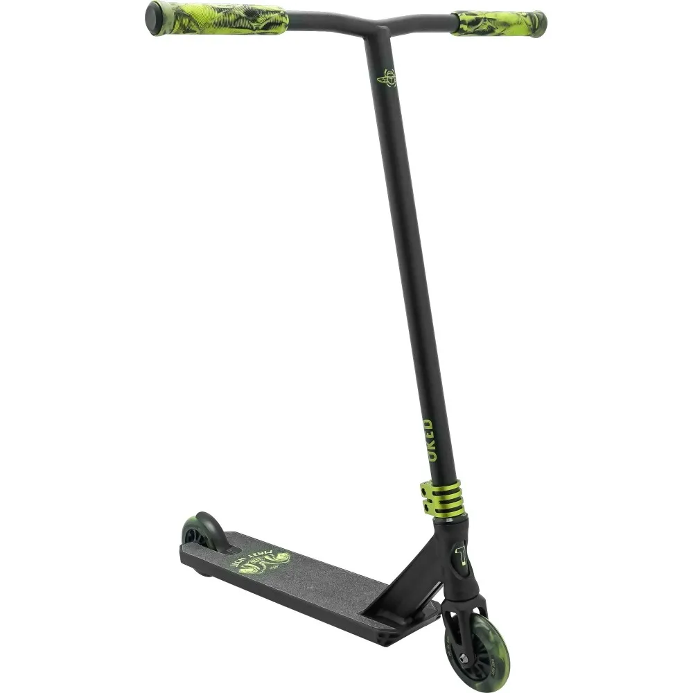 Компания Tech Team выпустила трюковой cамокат AKER 2020. Девиз этой модели – простота и надежность. Модель подойдет не только для тренировки экстремальных трюков, но и для катания по парку. Самокат довольно легкий. Его вес всего 4 кг. Подойдет для человека ростом от 155 см до 170 см. Руль высотой 62 см, шириной – 59 см. Но при желании руль можно отрегулировать по высоте. Форма руля напоминает буку «Т» и сделан он из стали. На руле установлены резиновые грипсы, которые удобно держать при поездке. Детали модели AKER 2020 выполнены из прочного и легкого материала – алюминия.  Дека самоката покрыта антискользящим покрытием. Самокат оснащен стальным и жестким тормозом, крепленным двумя болтами. Размеры колес универсальны для трюкового самоката и их диаметр 110 мм. Они хорошо сбалансированы, маневренны и сохраняют скорость. Колеса смешанного черно-зеленного цвета и работают на подшипниках ABEC 9. Сам самокат выполнен в черном матовом цвете. На шкурке модели изображены две головы тигра, а под декой нарисовано красивое граффити тигра с двумя головами.